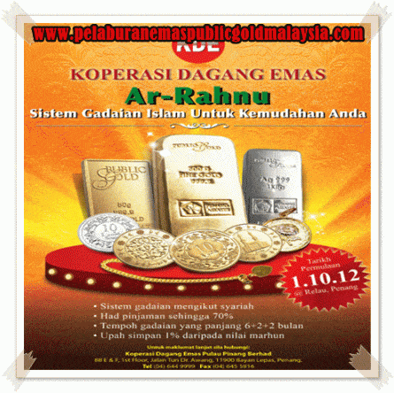 Kini public gold telah maju selangkah lagi dengan membina arrahnu gadaian islam di bawah anak syarikat Koperasi Dagang Emas iaitu tempat pajak atau gadai jongkong emas, jongkong perak dan barangan kemas. Klik ARRAHNU ISLAM GADAI EMAS DINAR GOLD BAR PERAK PUBLIC GOLD untuk membaca mengenai arrahnu islam public gold untuk gadai emas dan perak.