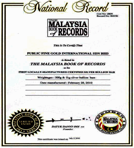 Public gold mendapat pengiktirafan Malaysia book of record. Syarikat emas pertama Malaysia yang mengeluarkan jongkong perak atau silver bullion bar